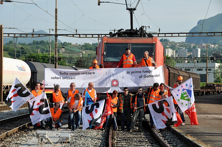 Mit einer symbolischen Gleisbesetzung in den Rangierbahnhöfen Basel-Muttenz und Chiasso haben die Bahngewerkschaften auf ihre Forderungen bei der Gotthard-Eröffnung aufmerksam gemacht. Die europäische, deutsche, italienische und die Schweizer Bahngewerkschaft SEV fordern gemeinsam das Prinzip, dass für ausländisches Personal die Löhne des Landes gelten, wo die Arbeit geleistet wird.