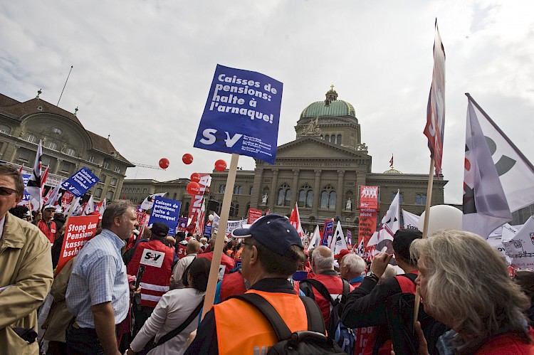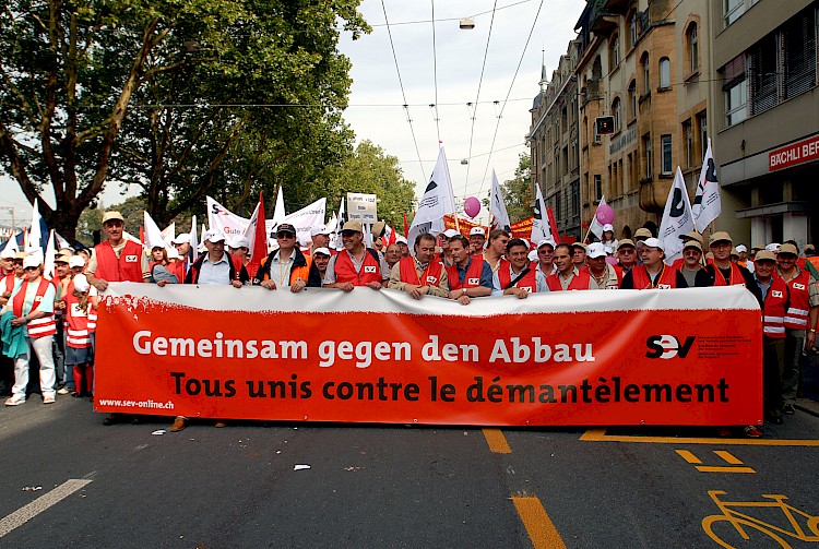 Am 19. September 2009 demonstrierten trotz strömendem Regen über 7'000 SEV-Mitglieder in Bern gegen den «Pensionskassenbschiss» und beteiligten sich anschliessend an einer SGB-Grossdemonstration.