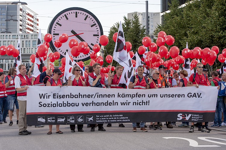An sechs Orten in der Schweiz sind rund 1400 Eisenbahnerinnen und Eisenbahner für den GAV SBB auf die Strasse gegangen. Sie folgten dem Ruf der Gewerkschaft des Verkehrspersonals SEV. Mit Ballon-Postkarten appelierten sie an die SBB-Führung, nicht länger auf ihren überzogenen Forderungen zu beharren und beim zu erneuernden GAV auf Kosten des Personals zu sparen.